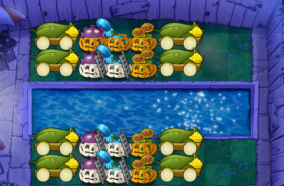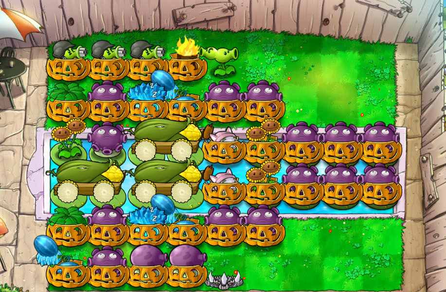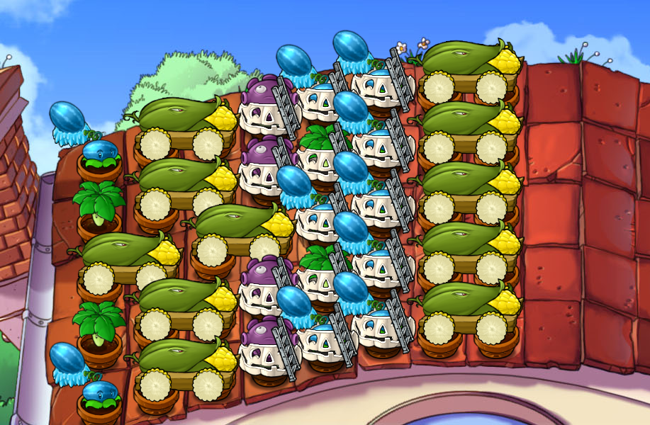 - 散炸炮阵 —— 容错极大的无脑阵,炮、卡、IO谁上都可以,玩弄僵尸于股掌之间。适合新手,操作起来比较有趣。无所谓炮和IO谁占主导权。