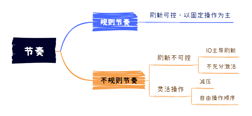 我们称,刷新节奏主观可控且以固定操作为主的叫做“规则节奏”,否则是“不规则节奏”。